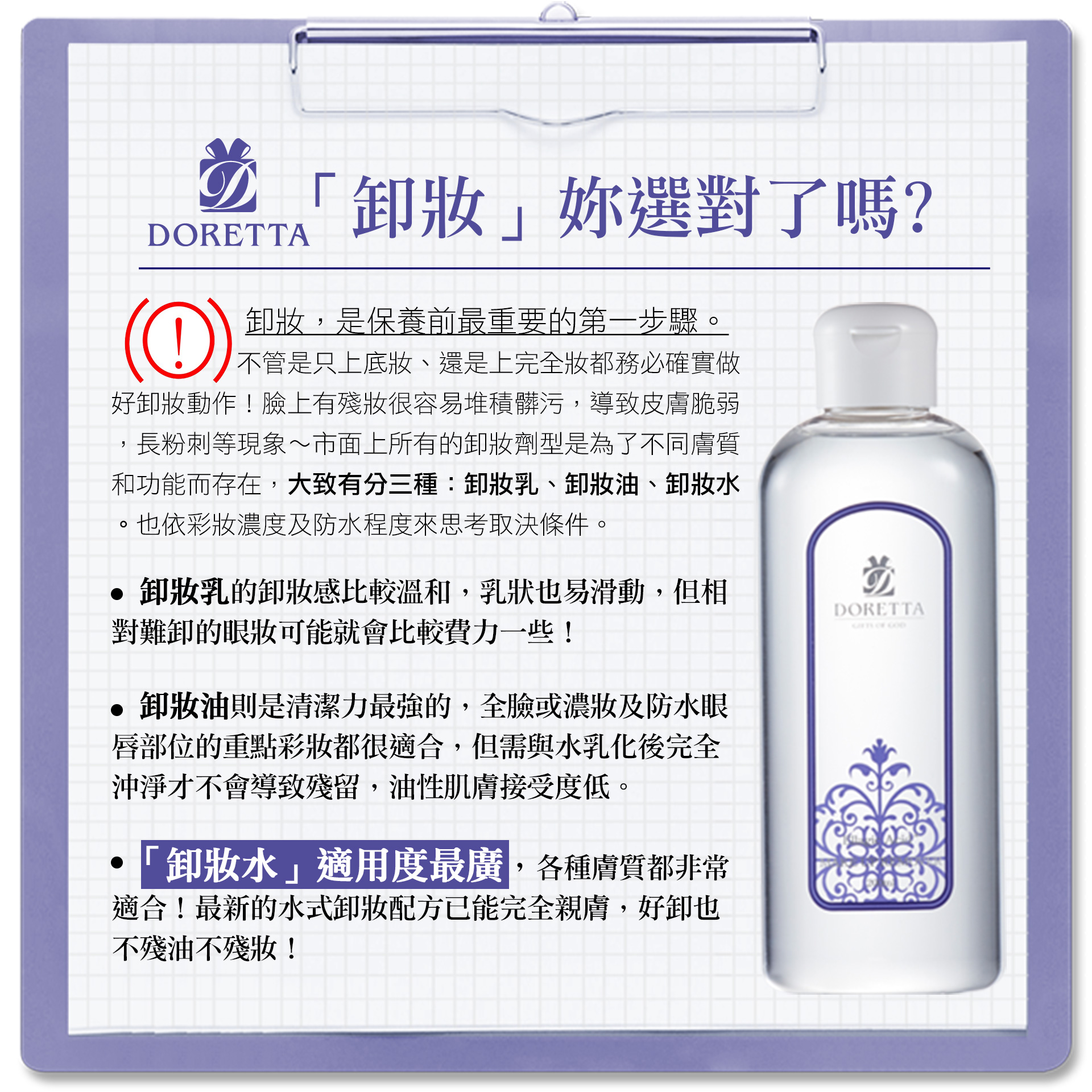保養』必備利器. DORETTA鞣花酸潤白即淨卸妝水. 一分鐘溫和卸除 ...